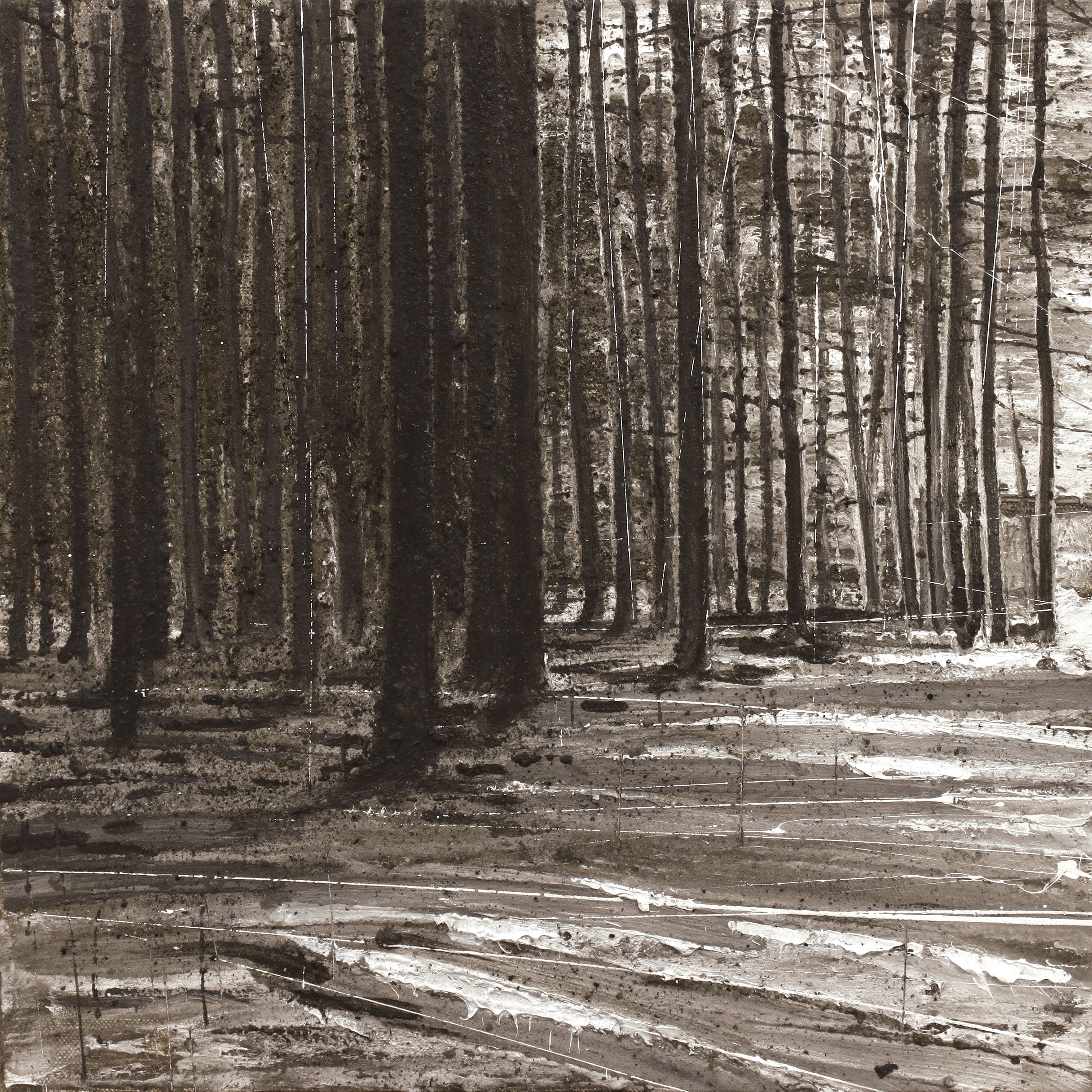 Nel 2010 inizia a usare l’olio di motore esausto, un altro elemento di origine naturale che ha concluso il proprio ciclo di vita. Oltre al valor simbolico, il nero ottenuto da esso gli consente una profondità difficilmente raggiungibile con un colore “artificiale”. Successivamente inserisce anche il rame ossidato, con delle gradazioni che vanno dal celeste al verde fino al rosso ruggine, inizialmente usato per dipingere una serie di geyser sudamericani. Le opere sono condizionate dalla materia e al tempo stesso sono tutt’uno con essa; il paesaggio non è solo dipinto ma è anche il medium con il quale viene dipinto. E il territorio diventa indissolubilmente legato al nostro modo di vedere la realtà. E qui subentra il ricordo.
