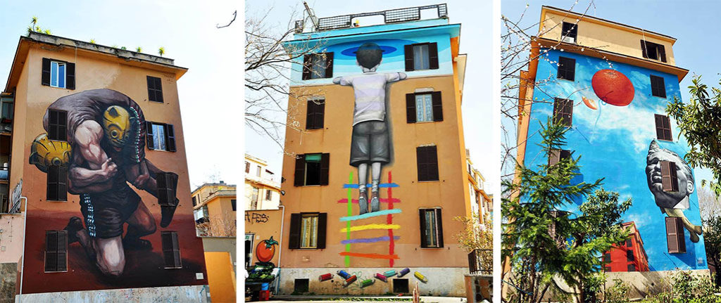 Le facciate di undici palazzine del comprensorio di viale Tor Marancia 63 sono diventate “tele giganti” alte 14 metri. A realizzarle 22 artisti provenienti da 10 paesi. È solo l’inizio. Siamo sicuri che l’associazione culturale 999Contemporary, responsabile del progetto insieme al Comune di Roma, saprà continuare l’egregio processo di abbellimento.