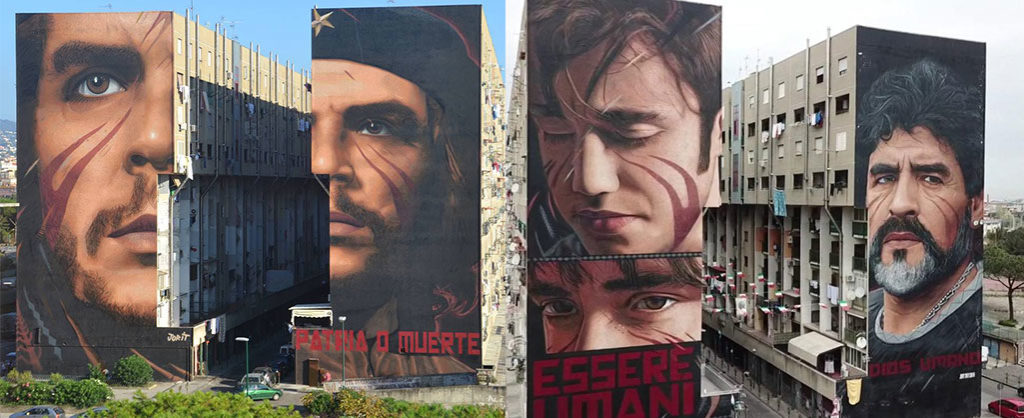 Ma c’è davvero bisogno di andare fino in Florida per osservare i giganteschi murales? No no no. Anche tanti quartieracci italici –dimenticati, malati, incancreniti da abbandono e microcriminalità– hanno saputo risvegliarsi, farsi notare, gridare a tutti la loro presenza e la forza delle persone che li abitano.