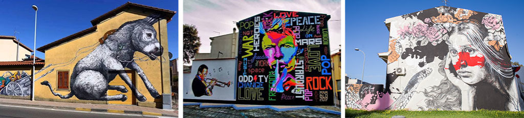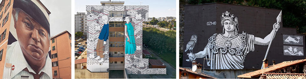 Davvero infiniti sono i murales che come funghi al cambio di luna spuntano sulle pareti di palazzi affaticati dal tempo: Fantozzi nel quartiere Certosa di Genova disegnato dal duo Rock & Loste; Wish a Lecce realizzato da Millo; la Dea Minerva trai tetti di Breno (Brescia) dipinto da OZMO. Giusto per citarne alcuni particolarmente significativi.